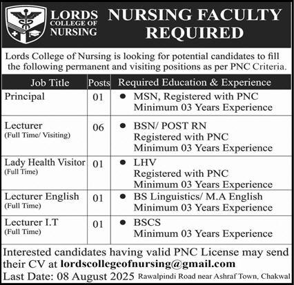 🩺 Lords College of Nursing – Faculty Positions (Chakwal)